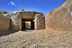 La cámara y el corredor de acceso tienen casi veinte metros de longitud y están orientados en dirección este-oeste.[7] El corredor está dividido en tres tramos —un atrio y dos antecámaras—, bien delimitados mediante parejas de losas verticales a ambos lados, a modo de jambas que estrechan el paso entre ellas. El atrio junto a la entrada es una especie de vestíbulo de planta trapezoidal, probablemente sin cubierta en origen, que actúa como rampa de acceso a la primera antecámara y quizá también como espacio ceremonial destinado al depósito de ofrendas. Las dos antecámaras son estructuras adinteladas con una altura que varía entre 1,1 y 1,6 metros, y que se estrechan ligeramente conforme nos aproximamos a la cámara final.[8][2]