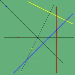 Cambiando a coordenadas homogéneas usando la incrustación de (a, b) ↦ (a, b, 1), la extensión al plano proyectivo real se obtiene permitiendo que la última coordenada sea 0. Recordando que las coordenadas de punto se escriben como vectores columna y las coordenadas de recta como vectores fila, se puede expresar esta polaridad de la siguiente manera: