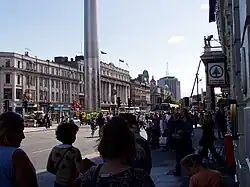 O'Connell Bridge y O'Connell Street desde Westmoreland Street. Al fondo, el Spire, el arte público más alto del mundo emplazado donde originalmente se situaba la Columna de Nelson, que fue vandalizada por activistas republicanos en 1966.