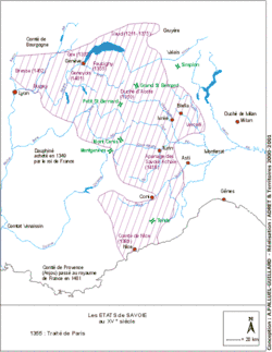 - ↑ Robert Avezou (1944, 1948, 1963). Histoire de la Savoie. Que sais-je? (en francés) (42). PUF. p. 128. ISSN 0768-0066.