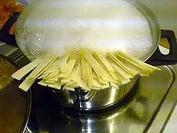 Hervir es el método de cocinar alimentos en agua hirviendo u otros líquidos a base de agua, como caldo o leche[14] Hervir a fuego lento es un hervor suave, mientras que al escalfar el líquido de cocción se mueve pero apenas burbujea.[15]