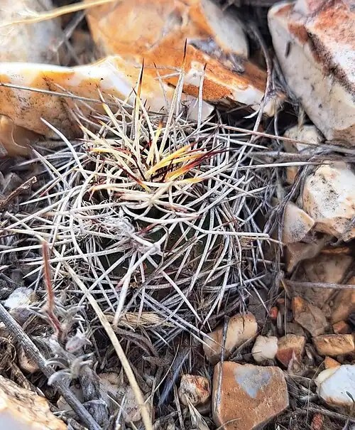 Las espinas pueden ser blancas, grises, rojizas o marrones, y se disponen de forma saliente con una leve curvatura. Suele presentar una espina central, de 1 a 1,2 cm de largo, aunque en ocasiones está ausente. También desarrolla entre 8 y 18 espinas radiales, de 0,5 a 1,3 cm de longitud. En ejemplares jóvenes, las espinas son pectinadas o pinnadas, de color blanco y se mantienen cerca del cuerpo.[3]