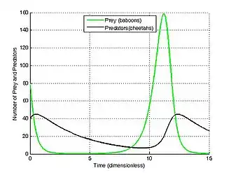 Las interacciones depredador-presa exhiben oscilaciones naturales en las poblaciones tanto del depredador como de la presa.[21] En 1925, el matemático estadounidense Alfred J. Lotka desarrolló ecuaciones simples para las interacciones depredador-presa en su libro sobre biomatemáticas.[22] Al año siguiente, el matemático italiano Vito Volterra, realizó un análisis estadístico de las capturas de peces en el Adriático[23] y desarrolló de forma independiente las mismas ecuaciones.[24] Es uno de los primeros y más reconocidos modelos ecológicos, conocido como modelo Lotka-Volterra: