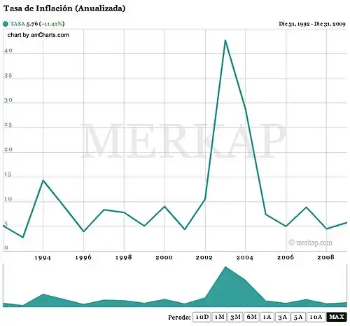 La depresión económica durante la segunda mitad de los 80 y principios de los 90, durante la cual el PIB se contrajo un 5 %, la inflación alcanzó el 100% y la moneda se devaluó a 1.56 pesos oro por 1 dólar en 1982, 4×1 en 1987, 13 pesos oro por 1 dólar en 1996 y 16×1 en 2000. A partir de 1995 la República Dominicana entró en un período de crecimiento moderado y disminuyente inflación hasta 2002, luego del cual, la economía entró en recesión. El PIB se contrajo un 1% en 2003, mientras la inflación se disparó por encima del 27% y la prima del dólar se situó a 50×1.