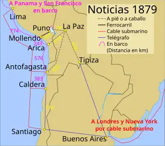 La situación de Bolivia estaba caracterizada por el aislamiento, por los largos, inhóspitos y difíciles caminos para comunicarse con otros países a través de la Cordillera de los Andes, el Desierto de Atacama o los largos caminos a Buenos Aires. La capital, Sucre, no estaba conectada al mundo por el telégrafo y las noticias debían ser enviadas a Arica o Tacna a pie. Para el viaje a Cobija se necesitaban 15 días, a Arica 5 o 6 días, para Mollendo se debía viajar a pie, luego el lancha y por último en tren. Existieron, durante la crisis 1878-79, negociaciones para extender el ferrocarril de Antofagasta al Altiplano, pero lamentablemente no prosperaron.[2]: pág.152-153
