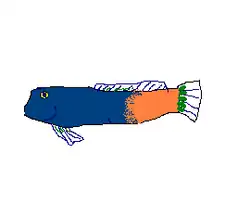 • Los machos pueden llegar alcanzar los 11 cm de longitud total.[1][2] Es curiosa la coloración de este pequeño pez que se encuentra dividida en dos partes. Desde el abdomen a la cabeza una coloración oscura marrón azulada y desde el abdomen a la cola en un naranja brillante. El brillo del animal dependerá de su posición jerárquica en el acuario. Los individuos de menor posición mostrarán una única coloración. Es una especie territorial compatible con los invertebrados sésiles.[3]