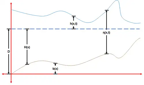 Las ecuaciones de aguas poco profundas se derivan de las ecuaciones de conservación de la masa y conservación del momento lineal (las ecuaciones de Navier-Stokes), que se mantienen incluso cuando se rompen los supuestos de aguas poco profundas, como a través de un salto hidráulico. En el caso de un lecho horizontal, con unas fuerzas de Coriolis, de fricción y viscosidad despreciables, las ecuaciones de aguas someras son: Aquí η es la altura total de la columna de fluido (profundidad instantánea del fluido en función de x, y y t), y el vector 2D (u, v) es la velocidad de flujo horizontal del fluido, promediada a través de la columna vertical. Además g es la aceleración debida a la gravedad y ρ es la densidad del fluido. La primera ecuación se deriva de la conservación de la masa, las dos segundas de la conservación del momento.[3]