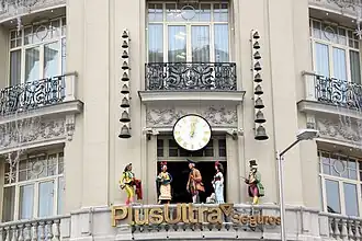 En el balcón del primer piso se encuentra un carillón que además de dar las horas en momentos puntuales del día presenta un pequeño espectáculo de figuras móviles, el único de España en el momento de su inauguración.[5] La idea surgió de la aseguradora como homenaje a la ciudad de Madrid. Su coste es un absoluto secreto.