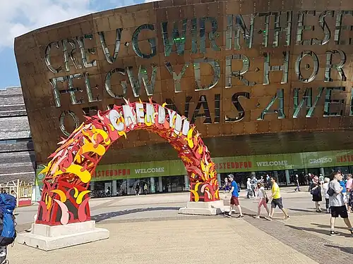 ![]() El arco del Eisteddfod en Roald Dahl Plass, Bahía de Cardiff. | ||