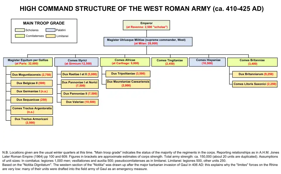 Según la Notitia, 10 de los 12 duces de occidente también reportaban directamente al magister utriusque militiae y no a sus comes regionales.[111][119] Sin embargo, esto no encaja con la situación en oriente y probablemente no refleja la situación real en 395 o incluso en 425. Habría sido claramente una organización muy poco práctica, dado que la falta de conexión entre los mandos habría hecho imposible la operación conjunta entre los comitatus y los ejércitos fronterizos. El periodo caótico entre 406 y 425 probablemente llevó a diversos cambios ad hoc en las relaciones entre los mandos en función de las necesidades del momento. Enfrentados con los confusos datos de borradores anteriores, los redactores finales de la Notitia presumiblemente decidieron en tomar la solución más simple, mostrando a todos los oficiales reportando directamente al magister utriusque militiae. Sin embargo, sí que sobrevive alguna traza de verdadera organización: la Notitia muestra a los duces de Caesariensis y de Tripolitania reportando al comes Africae.[111] El único dux que probablemente reportó directamente al magister utriusque militiae fue el dux Raetiae I et II, cuyas provincias pertenecían a la diócesis de Italia.