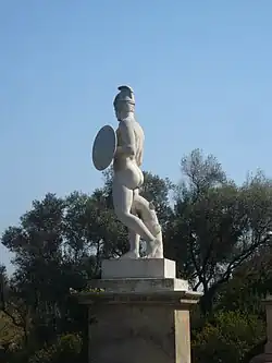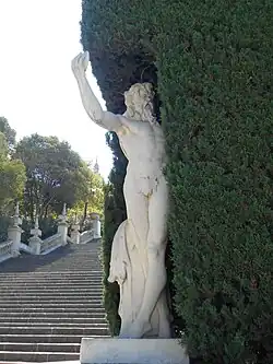 | Doríforo | Talleres Lena | Resina con fibra de vidrio | 4,18 x 1,34 x 1,34 m | Junto al Sileno bailando, esta obra se encuentra al inicio de la escalinata, junto a una hilera de cipreses paralela a las escaleras. Representa a un joven guerrero «portador de lanza» (tal como significa doríforo en griego), desnudo y en posición de contrapposto, de complexión musculosa y aspecto sereno y equilibrado, un fiel reflejo del kouros clásico griego.[20] |
