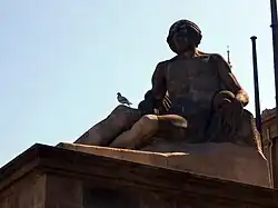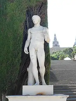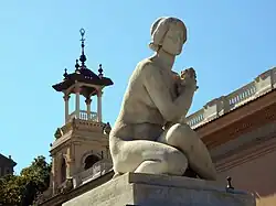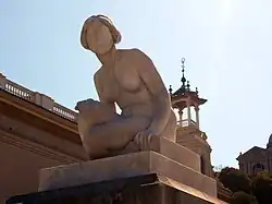 | Sedente | Josep Llimona | Mármol | 3,57 x 2,06 x 2,22 | La segunda de las figuras de Llimona de la plaza de acceso a las escalinatas del Palacio Nacional es otra figura femenina desnuda, también sentada y con el brazo derecho apoyado en la pierna del mismo costado, mientras que el izquierdo se apoya en el podio sobre el que se sienta. Ambas figuras responden a modelos tratados por el artista con asiduidad, que siguen un canon de belleza de aspecto mediterráneo frecuentemente cultivado en esta época por los artistas novecentistas.[19] |