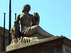 | El Agua | Frederic Marès | Piedra | 3,29 x 3,70 x 1,98 m | Las dos últimas figuras, situadas en el mirador del Palacio Nacional, son obra de Frederic Marès. Son alegorías del agua y la tierra, ambas en posición sedente, de grandes dimensiones. El Agua es una figura masculina de aspecto hercúleo, en forma de dios-río apoyado sobre un jarrón del que mana el agua, con una actitud serena y paternal.[22] |