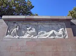 | Relieves de la plaza Carles Buïgas | Antoni Parera | Piedra arenisca | 1,15 x 4,04 x 0,11 m (meridional), 1,12 x 3,98 x 0,10 m (septentrional) | En las paredes laterales de las escaleras que conducen a la Fuente Mágica se colocaron dos relieves alegóricos de las glorias, con una compleja iconografía que alude a la historia mediterránea y catalana, conectando el pasado con el presente, a través de diversas figuras alegóricas: el comercio, la navegación, la industria, el conocimiento científico, el pensamiento, el trabajo, la luz de la verdad y de la ciencia, el laurel de la victoria y la alada Iris, mensajera de los dioses.[14] |