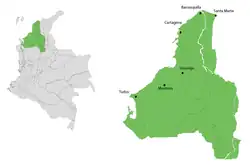 Este eje comprende los departamentos colombianos sobre el Caribe continental occidental, a saber Atlántico, Bolívar, Córdoba y Sucre, y además musicalmente las riberas del río Magdalena en los departamentos de Magdalena y César. Sus prácticas musicales son la consecuencia de la mezcla de tradiciones europeas, amerindias y negras. Durante el siglo XX con el desarrollo de las big bands, varios de los géneros musicales fueron explorando nuevos rumbos, con diferentes instrumentaciones y variaciones melódicas y armónicas. El Carnaval de Barranquilla es uno de los eventos folclóricos en donde más se explotan los ritmos de este eje musical. De esta región proviene uno de los géneros musicales más conocidos de Colombia en el mundo: La cumbia.