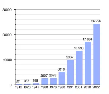 El municipio de El Bolsón tiene dos aglomeraciones de población: la aglomeración principal, El Bolsón, y Mallín Ahogado. Además, existe una cantidad de población rural dispersa.[9] La población del municipio es de 24 276 habitantes y 10 740 viviendas según el censo de 2022.[10] Este valor sitúa el municipio como el 9.º más poblado de la provincia.[10] Además, el censo dio a conocer datos de su composición poblacional (10129 hombres 11158 mujeres), población urbana sin población rural dispersa o localidades dispersas en el municipio (21287) densidad y área urbana.[11]