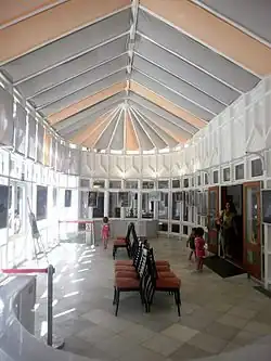 El vestíbulo, que está situado tras el pórtico de entrada al pie de la torre-minarete, tiene 12 m², planta hexagonal y actúa de distribuidor entre las tres plantas. El pavimento está compuesto por losas de mármol de forma circular mientras que el techo presenta un artesonado de madera con una franja de cinco vigas en el centro y dos grupos de siete vigas que recorren transversalmente la estancia. Esta sala tiene una vidriera con cenefas de formas geométricas y motivos ornamentales vegetales.[34]