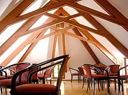 En la planta superior se encuentra el desván, dividido en dos por el salón principal ya que su altura llega hasta el techo del edificio, con acceso por dos escaleras de caracol. Tiene una superficie total de 140 m², con cubierta a dos aguas con una estructura de vigas de madera con diversos ángulos de abertura, más cerrados cuanto más cerca están del centro de la crujía. El desván cumplía también el objetivo de regulador térmico, aislando la planta noble de las temperaturas exteriores. En este espacio se hallaban las habitaciones del servicio y las dos alas estaban conectadas por un corredor exterior, paralelo a la cubierta del invernadero. Una de las habitaciones cuenta con una terraza semicircular que está sobre la galería de la sala de juegos. También hay un acceso a la terraza inferior de la torre-minarete.[41]