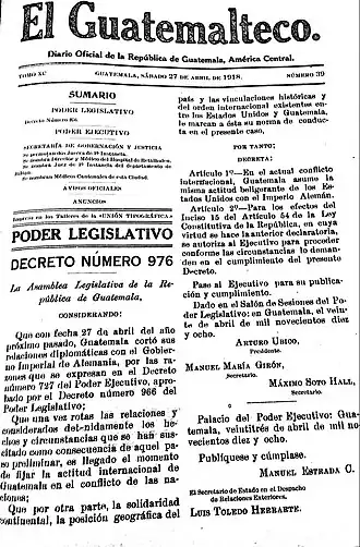 ![]() Portada del 27 de abril de 1918, en que Guatemala le declara la guerra al Imperio Alemán durante la Primera Guerra Mundial | ||