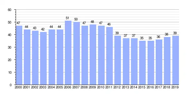 | Gráfica de evolución demográfica de O Pino (lugar) entre 2000 y 2019 |