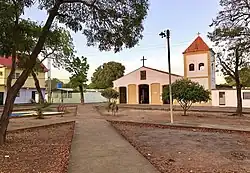 Su cubierta de madera y tejas es a dos aguas y las tres puertas de acceso, principales y laterales, son de madera. Sus pisos son de terracota y sus muros fueron construidos en tapia, aunque fueron frisados posteriormente. En cuanto a la configuración del espacio interior, la iglesia está compuesta de tres naves, y la central está apoyada sobre columnas circulares. Posee una torre de campanario con una cubierta a cuatro aguas, que se encuentra alineada en la fachada principal, en el lado de la epístola.