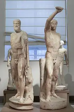 El grupo de los Tiranicidas, colocado en un gesto político colectivo por los ciudadanos, en el Ágora de Atenas en 476 a. C., es el mismo tipo de desnudo heroico, muerto en combate.[nota 29] Son dos héroes en el momento de su ataque al tirano Hiparco en 514 a. C. Aquí la acción sugerida con fuerza por el movimiento en el espacio de los dos cuerpos, uno al lado del otro, contrasta con los rostros completamente inexpresivos; un código que califica al héroe, amo de sí mismo. Su opuesto, la expresión de la violencia, les haría perder este autocontrol, caer en la embriaguez, la rabia.[74] Es una imagen construida con un valor simbólico y ejemplar. No hay «realismo» aquí para este primer monumento a la democracia en Atenas: los héroes estaban ciertamente vestidos durante el ataque, su desnudez es la de los héroes. Una clara diferencia de edad en esta pareja de amigos que derrotó al tirano distingue a Aristogitón, el hombre maduro y astuto, con músculos delineados y claramente definidos, y a Harmodio, más joven, con músculos más flexibles y atenuados, «como un vencedor rápido y fulminante» como Apolo.[75] Los dos hombres no tienen la misma edad. Si los atenienses eligieron este grupo ejemplar para colocarlo en el ágora, lugar de las asambleas democráticas, es porque, en su diversidad, dieron sustancia al valor esencial de la democracia: la participación igualitaria y disciplinada de los ciudadanos en los asuntos de la ciudad.