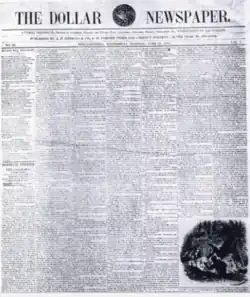 Poe vendió originalmente El escarabajo de oro a George Rex Graham para el Graham's Magazine por $ 52, pero pidió que se lo devolviera cuando se enteró de un concurso de escritura patrocinado por el Dollar Newspaper de Filadelfia.[21] Por cierto, Poe no le devolvió el dinero a Graham y, en cambio, se ofreció a compensarlo con reseñas que escribiría.[22] Poe ganó el gran premio, además de ganar $ 100. La historia se publicó en dos entregas el 21 y el 28 de junio de 1843.[23] El monto de $ 100 puede haber sido el máximo que le pagaron por una sola obra.[24] Anticipándose a una respuesta pública positiva, el Dollar Newspaper obtuvo los derechos de autor del cuento antes de su publicación.[25]