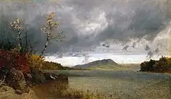 Este lago, originalmente llamado por los misioneros jesuitas lago del Santo Sacramento era, según comentó Thomas Jefferson a su hija en 1791 "el agua más hermosa que nunca he visto", fue un continuo motivo de inspiración para Kensett. El interés para reproducir con fidelidad los detalles de la vegetación venía de los pintores flamencos del siglo XV, pero también respondía a los principios de la hermandad prerrafaelita y del teórico John Ruskin. Tanto el color de las hojas del otoño como el color gris del agua, que refleja las nubes de tormenta, siguen estos principios.[5]