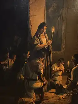 La obra nos muestra también el fin de un velatorio, esto se sabe por este hombre que está arrodillado en el centro de la composición y que sostiene una cuerda y una pala justo para sepultar al difunto.[6]