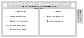 - ↑ UP (26 de septiembre de 2013). «Servel ratifica validez y registro de votos marcados con “AC”». El Mostrador. Consultado el 11 de noviembre de 2013.