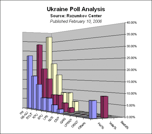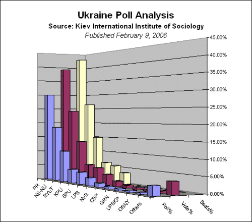- ↑ Razumkov Centre: 20 січня 2006 Електоральні рейтинги партій і блоків (Центр ім.О. Разумков) (enlace roto disponible en Internet Archive; véase el historial, la primera versión y la última). (Realizada entre el 12 y 17 de enero de 2006, publicada el 20 de enero, solo en ucraniano)