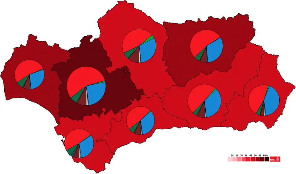 Las circunscripciones electorales en las elecciones al parlamento Andaluz, también en las elecciones generales españolas, coinciden con las distintas provincias. A continuación se presenta un cuadro con las provincias ordenadas por población, y consecuentemente por los diputados que aportan al parlamento, y sus resultados electorales:[3]