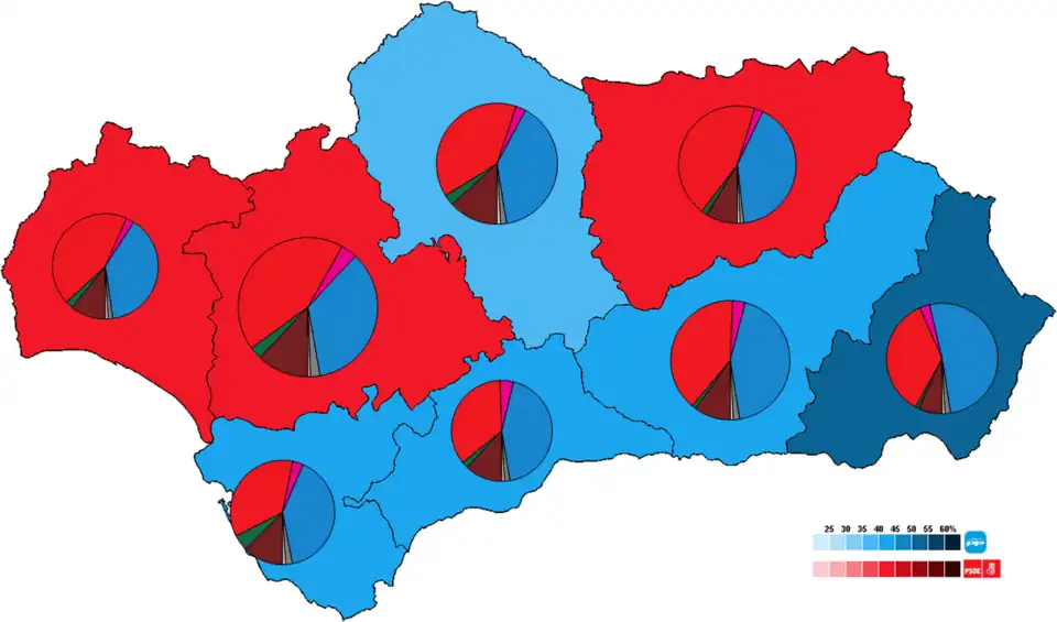 Estos comicios dieron como resultado la primera victoria del Partido Popular Andaluz en unas autonómicas andaluzas con 50 escaños, quedándose a cinco de la mayoría absoluta que hubiera permitido gobernar a Javier Arenas. El PSOE de Andalucía perdía su mayoría absoluta y por primera vez no fue la fuerza política más votada de la comunidad, quedándose a 40.000 votos y tres diputados del PP. Sin embargo, un pacto con Izquierda Unida Los Verdes-Convocatoria por Andalucía, que duplicó su número de escaños hasta los 12, permitió al PSOE-A gobernar conjuntamente con la formación de izquierdas. José Antonio Griñán mantuvo la presidencia de la Junta, en la que entró IULV-CA con una vicepresidencia y tres consejerías.[1][2]