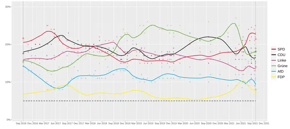 | Infratest dimap[11] | 24.02.2021 | 18 % | 22 % | 15 % | 23 % | 9 % | 6 % | 7 % |