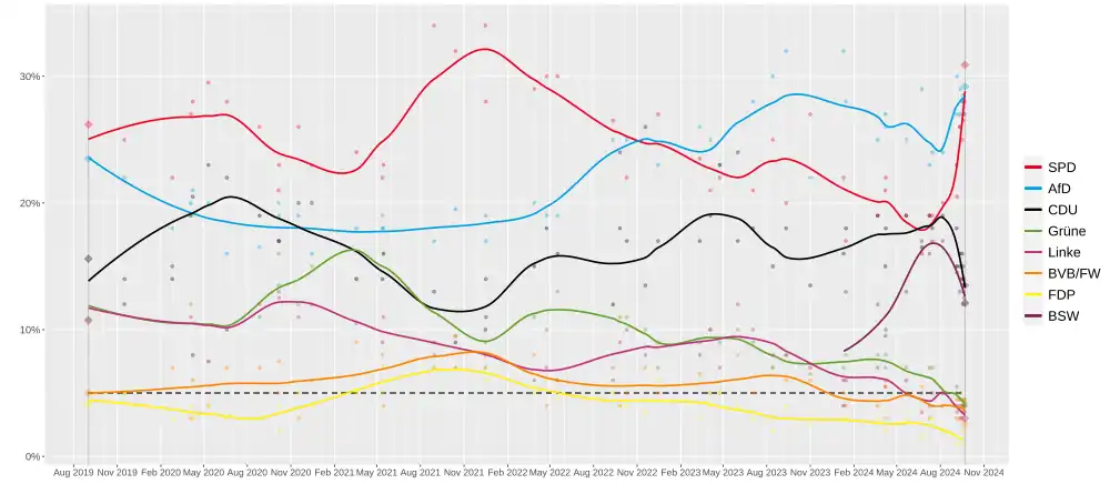 | Infratest Dimap[11] | 22 Sep 2024 | – | 31 | 30 | 12 | 5 | 3 | 2.7 | 0.8 | 12 | 3.5 | 1 |