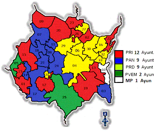 - 33 ayuntamientos. Formados por un Presidente Municipal y regidores, electos para un periodo de tres años, no reelegibles de manera consecutiva.