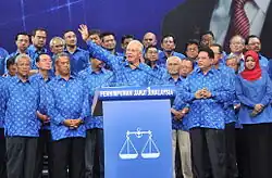 Ante esta "derrota" electoral, el Primer ministro Abdullah Ahmad Badawi dimitió como líder de su partido (la Organización Nacional de los Malayos Unidos o UMNO).[14][15] El 26 de marzo de 2009 se llevó a cabo una elección de liderazgo, donde el vice primer ministro y primer ministro interino Najib Razak fue elegido sin oposición como líder del partido UMNO.[16] El 2 de abril de ese mismo año, el primer ministro Abdullah presentó su renuncia ante Tuanku Mizan Zainal Abidin (que era el Yang di-Pertuan Agong). El 3 de abril, el primer ministro interino Najib Razak fue juramentado como el sexto primer ministro de Malasia en Istana Negara, Kuala Lumpur, frente a Tuanku Mizan Zainal Abidin.[17]
