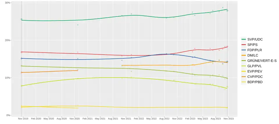 - ↑ Imhasly, Manuel; Füglister, Lukas (23 de octubre de 2023). «Darum schlägt das Polit-Pendel wieder nach rechts aus». Schweizer Radio und Fernsehen (SRF) (en alemán). Consultado el 23 de octubre de 2023.