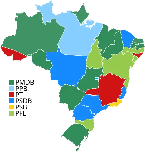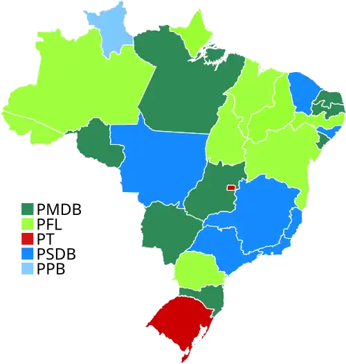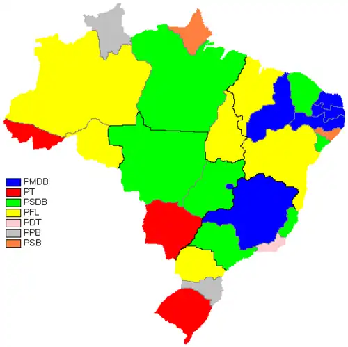 | São Paulo | SP | Mário Covas[26] | PSDB | Geraldo Alckmin[27] | PSDB, PTB y PSD | |