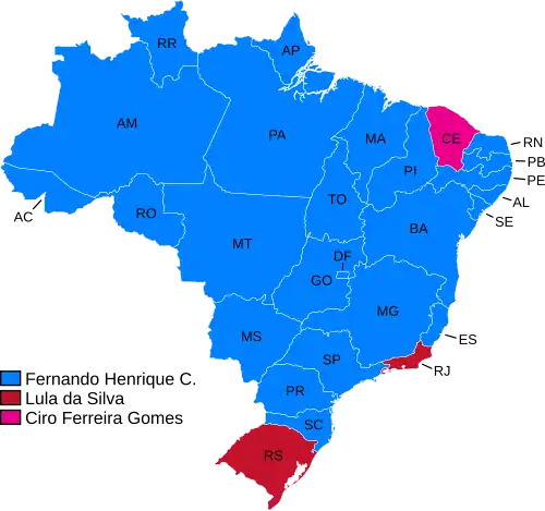 Dejando de lado las controversias, el entonces presidente Fernando Henrique Cardoso, respaldado por una coalición que incluía a los tres principales partidos de la época (el Partido del Frente Liberal, el Partido del Movimiento Democrático Brasileño (que le ofreció su apoyo informal) y su propio partido, el Partido de la Social Democracia Brasileña) pudo ser reelegido en la primera ronda después de alcanzar el 53% de los votos válidos. Su margen sobre el candidato del Partido de los Trabajadores, Luiz Inácio Lula da Silva, fue del 21,3%, lo que le dio una segunda victoria aplastante; Es hasta la fecha la última victoria aplastante en la historia brasileña. Lula da Silva recibió casi el 32% de los votos. Ciro Gomes, entonces miembro del Partido Popular Socialista, quedó en tercer lugar, con casi el 11% de los votos.