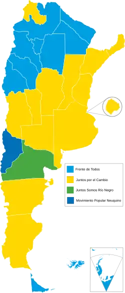 De las dos principales fuerzas políticas, Juntos por el Cambio sacó el 42,75 % de los votos obteniendo 14 senadores y 61 diputados, mientras que el Frente de Todos, sacó el 34,56 % de los votos obteniendo 9 senadores y 50 diputados. El resto de los puestos fueron cubiertos por partidos minoritarios.