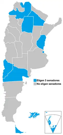 En esta oportunidad, las siguientes jurisdicciones de primer orden o distritos deberán renovar sus tres senadores: Ciudad Autónoma de Buenos Aires, Chaco, Entre Ríos, Neuquén, Río Negro, Salta, Santiago del Estero y Tierra del Fuego, Antártida e Islas del Atlántico Sur.[6]