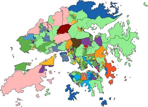 | Tsuen Wan | Pro-Pekín | DAB | Pro-Democracia | Cívico | 3 | 3 | 2 | 1 | 1 | 9 | 16 | 2 | 2 | 16/21 |