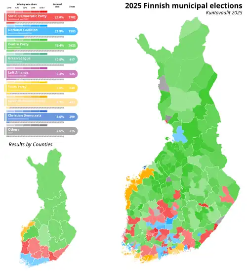 - ↑ «Koko maa, äänestysaktiivisuus» [Elecciones municipales 2025]. tulospalvelu.vaalit.fi (en finés). 13 de abril de 2025. Consultado el 13 de abril de 2025.