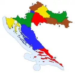 Desde 1999, Croacia se ha dividido en 10 distritos electorales del Parlamento, nombrados con números romanos. Estos distritos se basan más o menos en la geografía, pero se les da forma según la cantidad de votantes, de modo que cada distrito tiene aproximadamente el mismo número de votantes registrados, alrededor de unos 400,000.[20] Por lo tanto, estos distritos no corresponden a las fronteras de las principales divisiones administrativas dentro de Croacia y cada distrito contiene uno o más o partes de varios condados croatas.