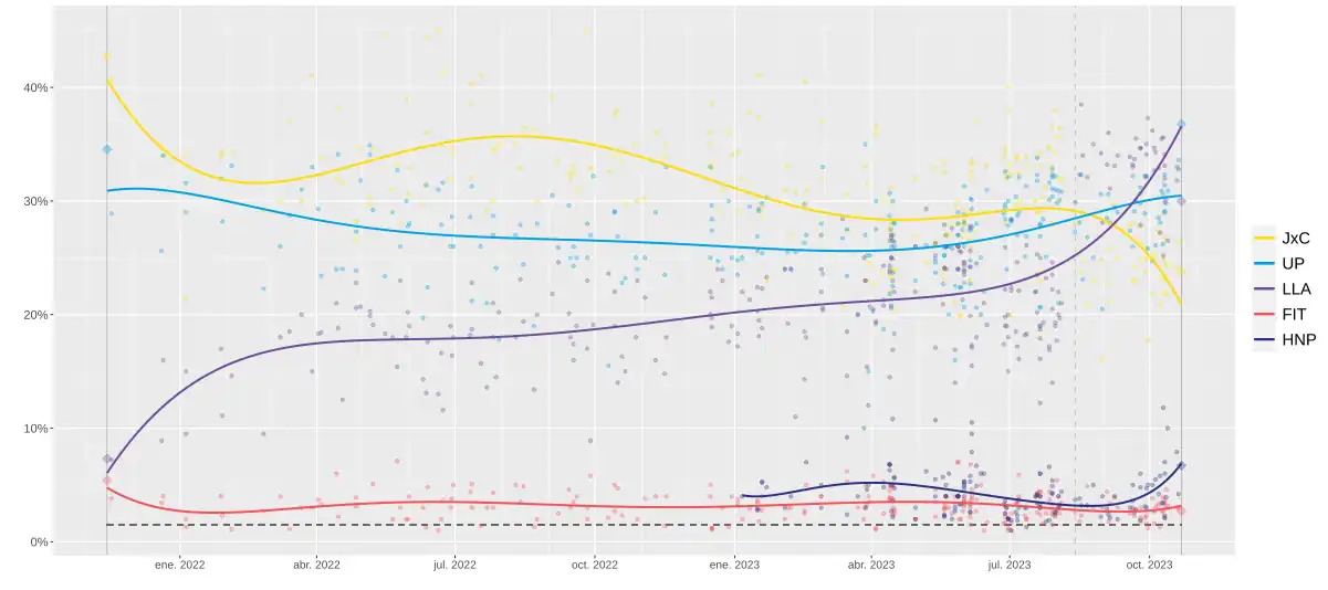 La primera vuelta se caracterizó por ser una elección entre tres fuerzas principales, en la que los candidatos de las coaliciones Unión por la Patria (UP), La Libertad Avanza (LLA) y Juntos por el Cambio (JxC) canalizaron el 90,58% de los votos válidos, distribuido en forma escalonada, con una ventaja de UP de 6,78% sobre LLA según el escrutinio definitivo, quedando JxC en tercer lugar y fuera del balotaje, con casi un cuarto de los votos. El resto de los votos válidos —el 9,4%— se distribuyó entre el candidato Juan Schiaretti de la coalición política Hacemos por Nuestro País y la candidata Myriam Bregman de la coalición Frente de Izquierda y de Trabajadores-Unidad. De esta forma quedó fuera de la disputa presidencial JxC, que era la principal coalición opositora, desatándose una crisis en dicha fuerza debido al acuerdo postelectoral del macrismo con Milei para que el candidato de La Libertad Avanza reciba apoyo en contra del candidato Massa de Unión por la Patria.[7][8]