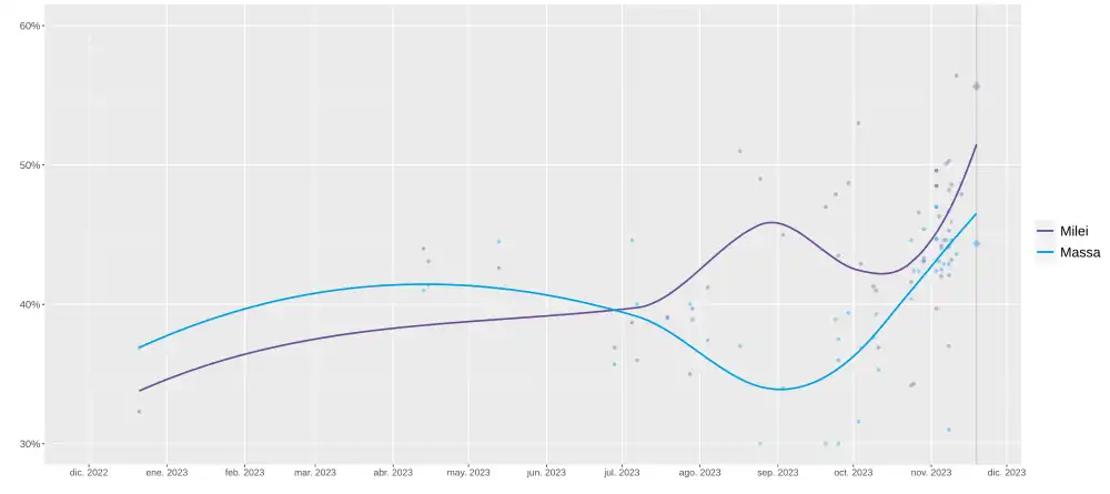 La segunda vuelta quedó marcada por la victoria de Javier Milei frente al oficialista Sergio Massa, en la que Milei logró sacar más de once puntos y una diferencia de casi tres millones de votos por encima del entonces ministro en el resultado electoral.[9][10] De esta forma, con más de catorce millones quinientos mil votos, Milei se convirtió en el candidato a la Presidencia de la Nación Argentina más votado en términos de cantidad numérica,[11][12][13] y simultáneamente el presidente con menos apoyo parlamentario de la historia argentina y el único cuya fuerza política no ganó ninguna de las gobernaciones provinciales.[14][15]