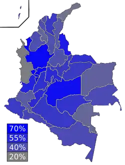 | Chocó | 12 720 | 21,20% | 42 791 | 71,33% | 1 083 | 1,80% | 1 212 | 2,02% | ||||||||||||||