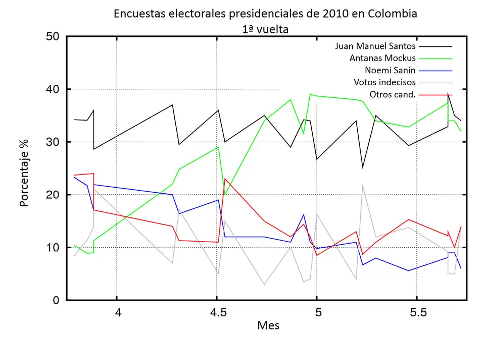 - ↑ EL ESPECTADOR, ed. (6 de mayo de 2010). «Nueva encuesta da a Mockus una ventaja de cuatro puntos sobre Santos».