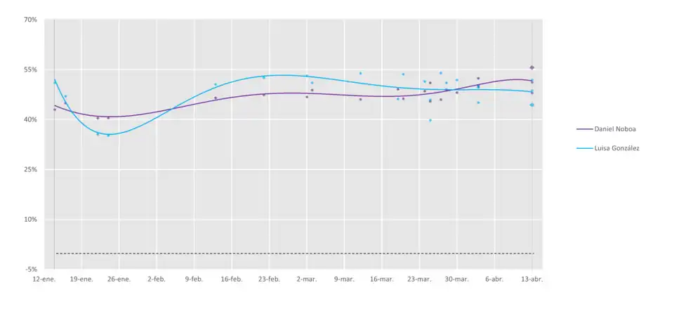 - ↑ «Diario de campaña: Encuestas 'alegres' y ansias por un 'mano a mano' con Noboa en el debate salen a flote». Primicias. 8 de enero de 2025. Consultado el 16 de enero de 2025.